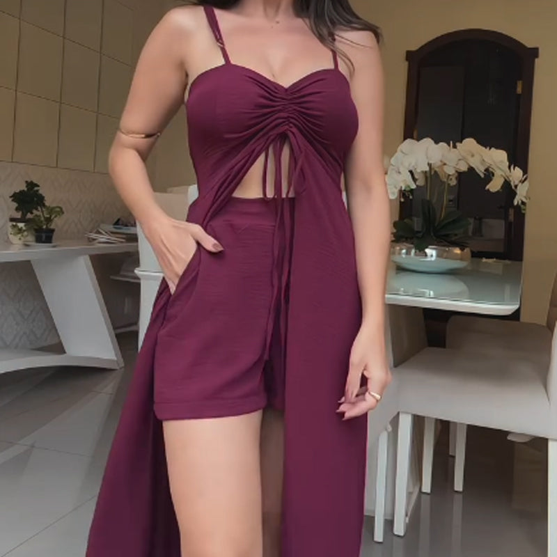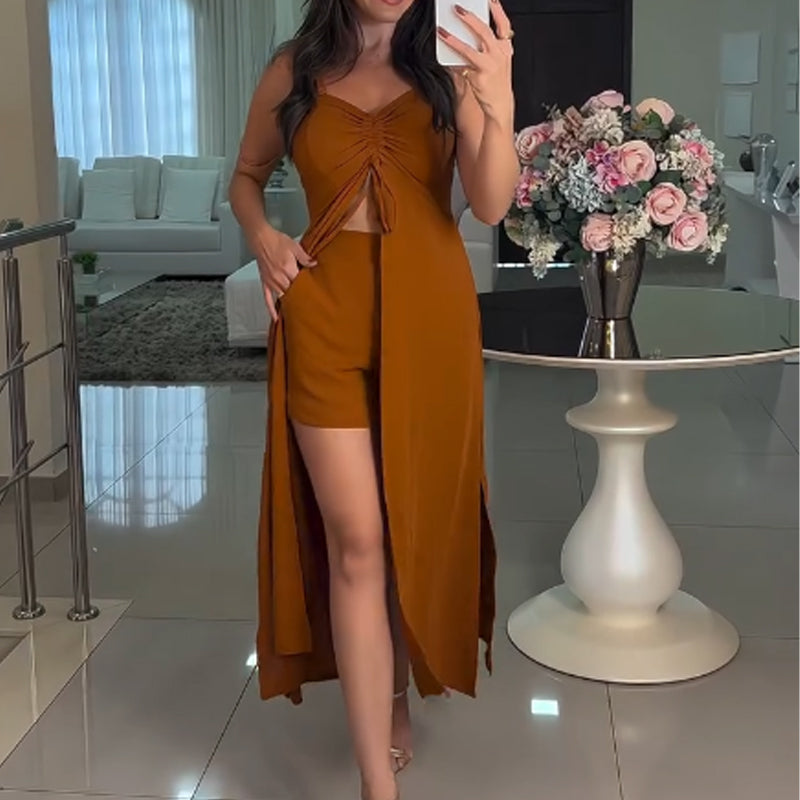 STILVOLLES ZWEITEILIGES SET: Dieses modische Set umfasst ein langes, fließendes Halteroberteil mit Spaghettiträgern und passende Shorts für einen abgestimmten, mühelos eleganten Sommerlook.